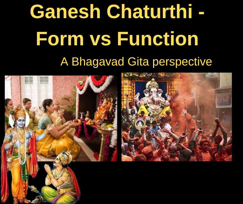 But as time passed, the Ganesh Puja during the British rule, began to be held in big public gatherings to promote political activism. From means of devotion to Ganesha, it had become a means of fostering national unity. In this modern era, filmy songs and dances replaced the devotional bhajans and traditional performances. The majestic Ganesh idols and gorgeous pandals have become more of a means to showcase political clout (BG 16.17) or to amass money through donations. The worship and rituals were greatly sidelined. A major impetus to attend these celebrations is fun, recreation and show of religiosity. This kind of spirituality does not yield tangible spiritual benefit (BG 17.13). In this way, the function of Ganesh Chaturthi got greatly lost though the external form remained. This is not just the predicament of Ganesh Chaturthi festival but of many spiritual festivities and activities across different faiths. This is a common problem in all spiritual traditions (BG 4.2).