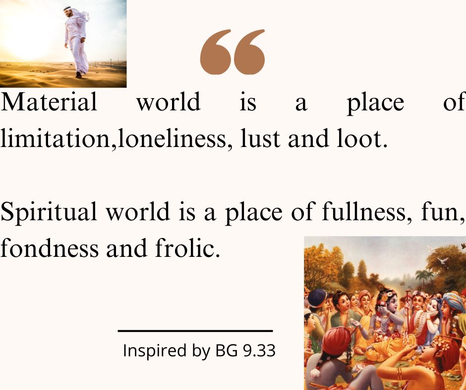 Material world is a place of limitation,loneliness, lust and loot.Spiritual world is a place of fullness, fun, fondness and frolic.Inspired by BG 9.33SHARE