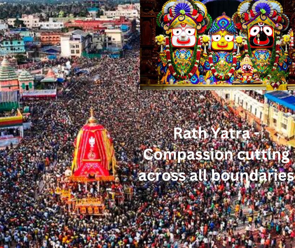 Lord Jagannath is worshipped with great care and provided utmost comfort. He has his personal time to take his meals prepared with great love and offered at several intervals. He has his personal time to relax and spend with his confidential associates. He stands in a comfortable and pleasant atmosphere. On the day of Rath Yatra, Lord Jagannath forgoes his comfortable and pleasant accommodation and takes to the road amidst the sweltering heat and restless mass of people. He sacrifices his private time and association of his confidential and intimate associates and gives his full time to bestow his compassion to the conditioned souls.