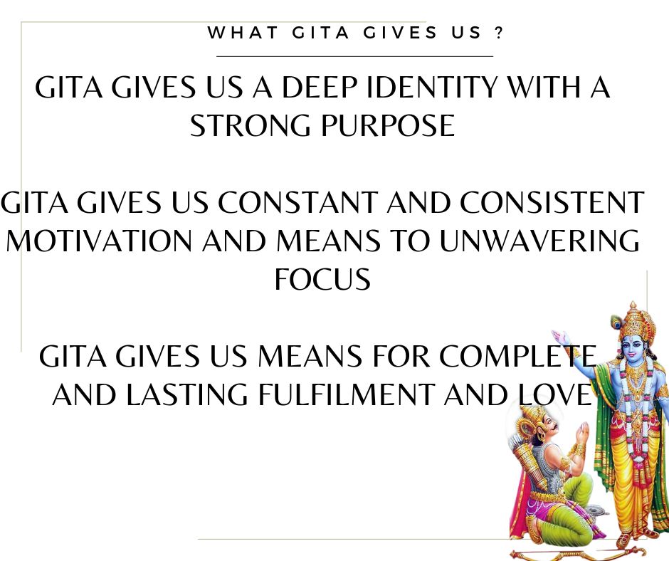 GITA gives us a deep identity with a strong purposeGita gives us constant and consistent motivation and means to unwavering focusGita gives us means for complete and lasting fulfilment and loveSHARE